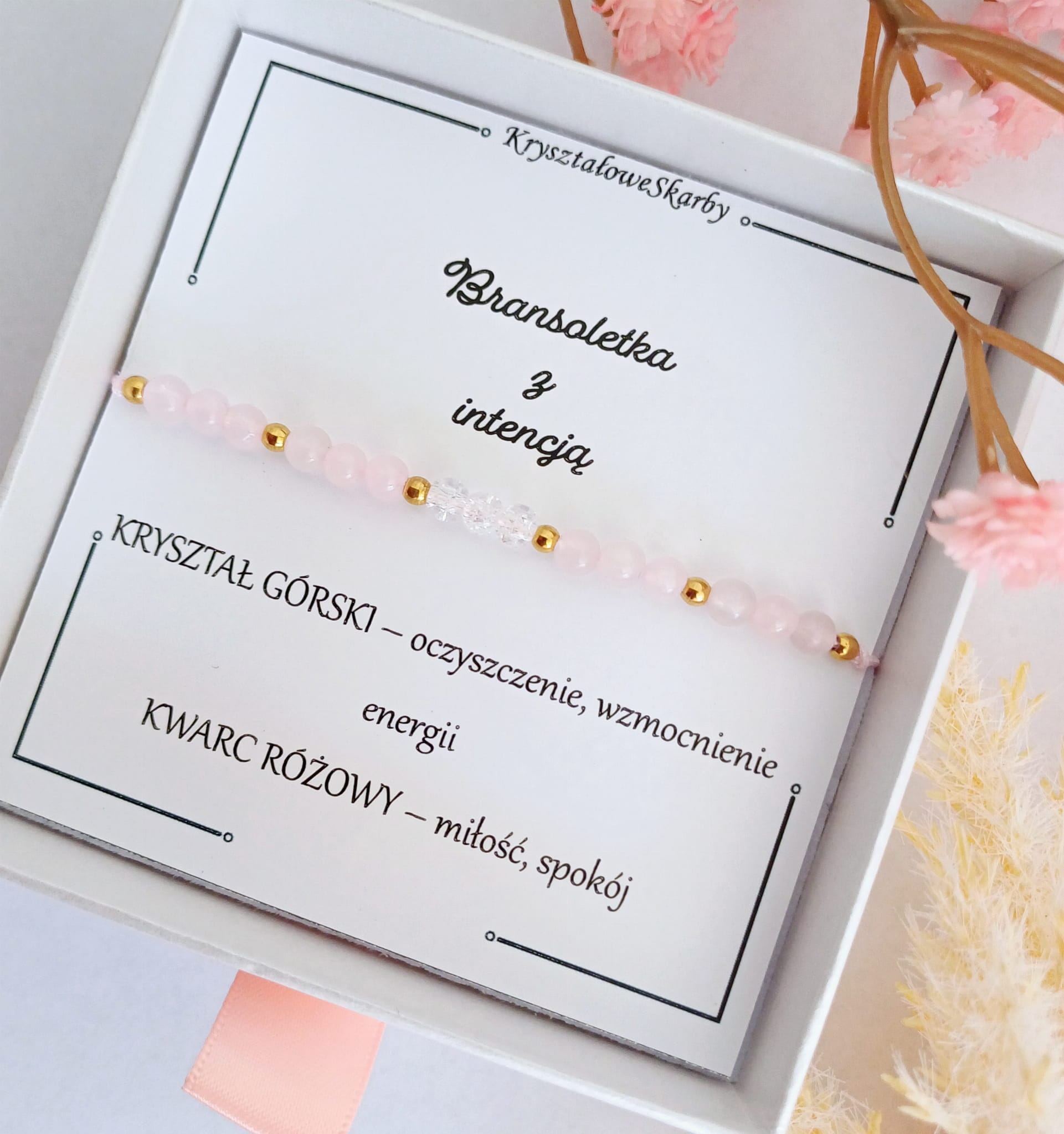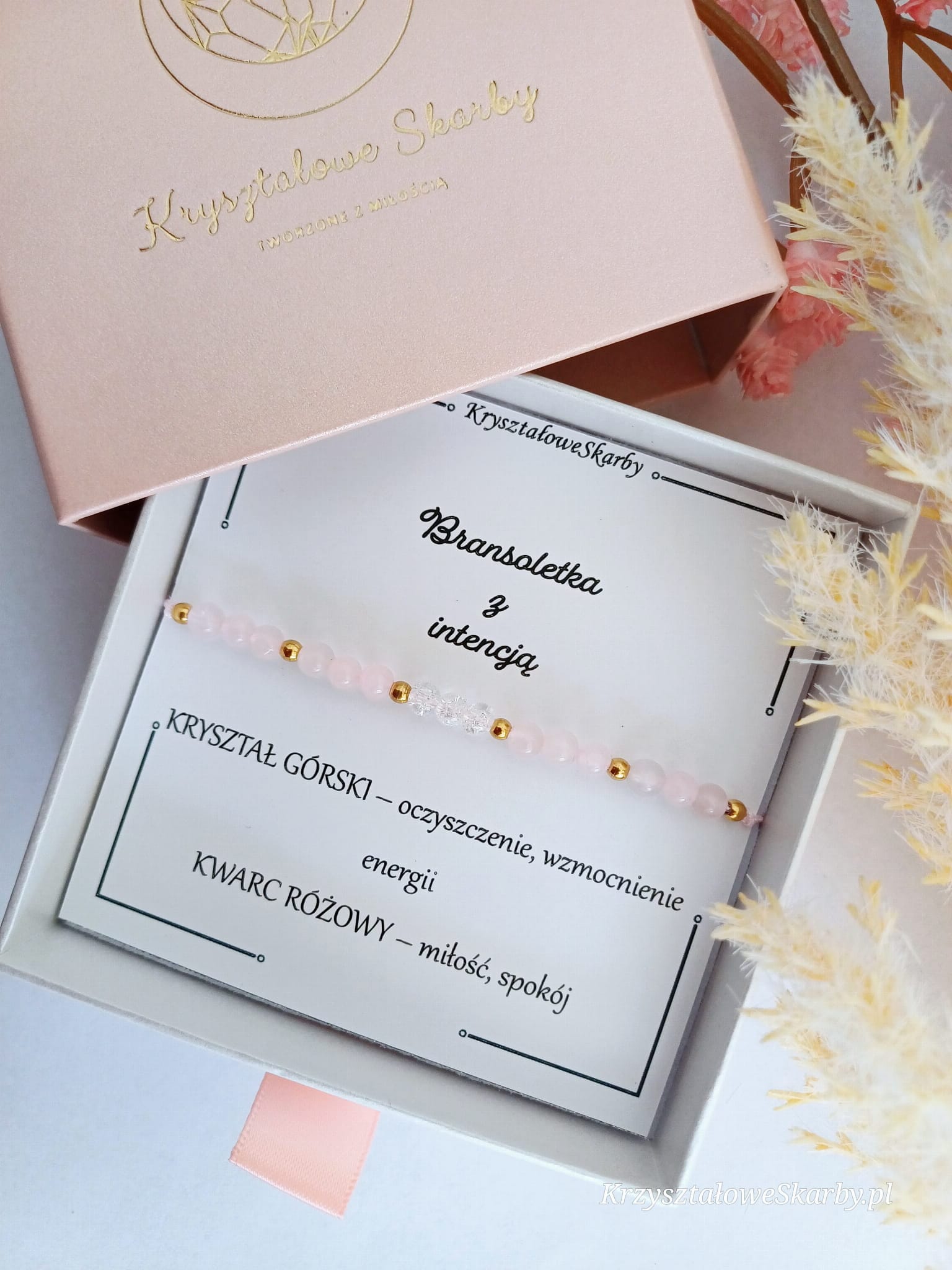 ✨ Materiały: Kwarc różowy, kryształ górski, stal nierdzewna
