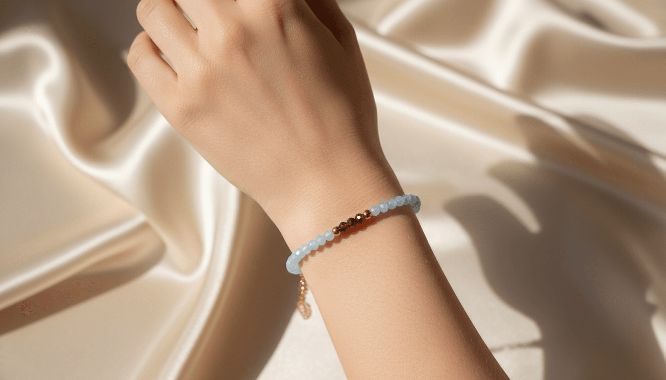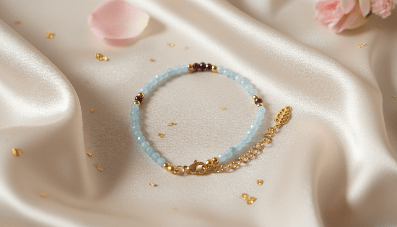 Delikatna bransoletka wykonana z fasetowanych koralików akwamarynu oraz granatu, wykończona elementami ze stali nierdzewnej w kolorze złota.