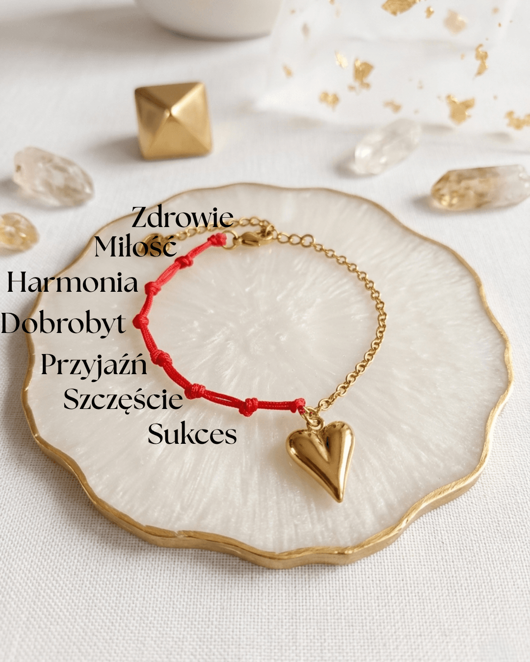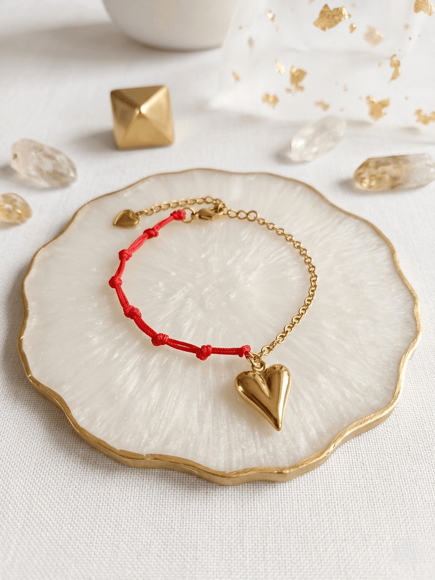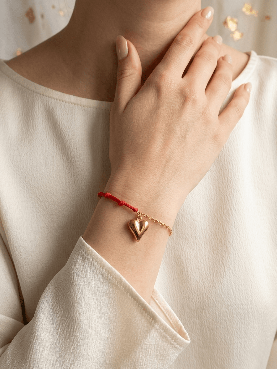 Delikatna bransoletka wykonana z czerwonego sznurka ozdobiona zawieszką w kształcie serca. Na sznurku znajduje się siedem węzłów, które według tradycji symbolizują ochronę oraz przyciąganie pozytywnej energii.