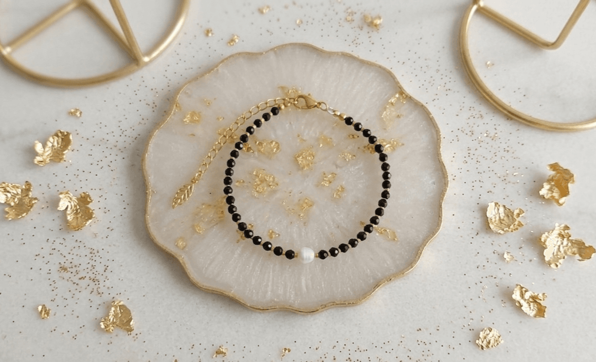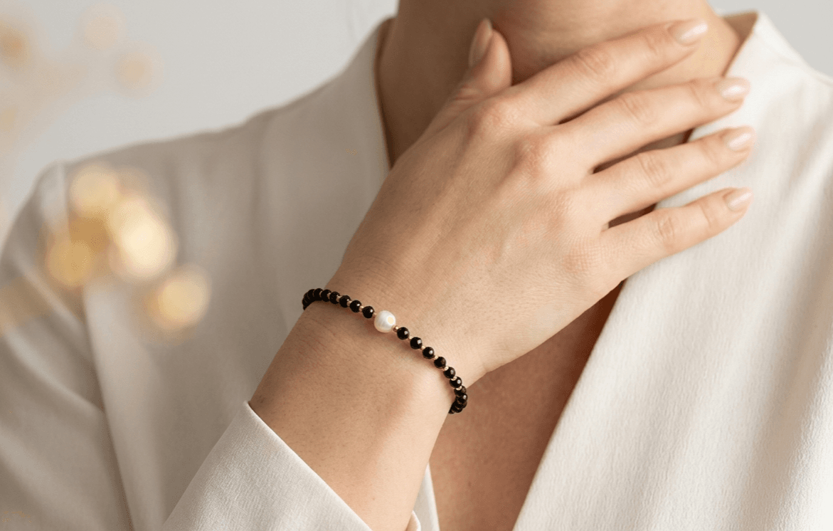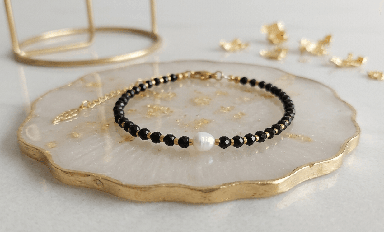Elegancka i subtelna bransoletka wykonana z naturalnych kamieni: czarnego spinelu, hematytu oraz perły. Klasyczne połączenie głębokiej czerni z delikatnym blaskiem perły tworzy ponadczasową i bardzo kobiecą biżuterię.