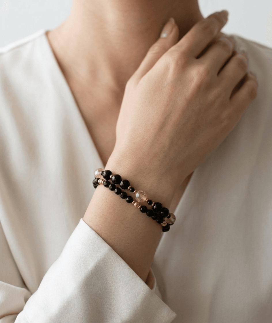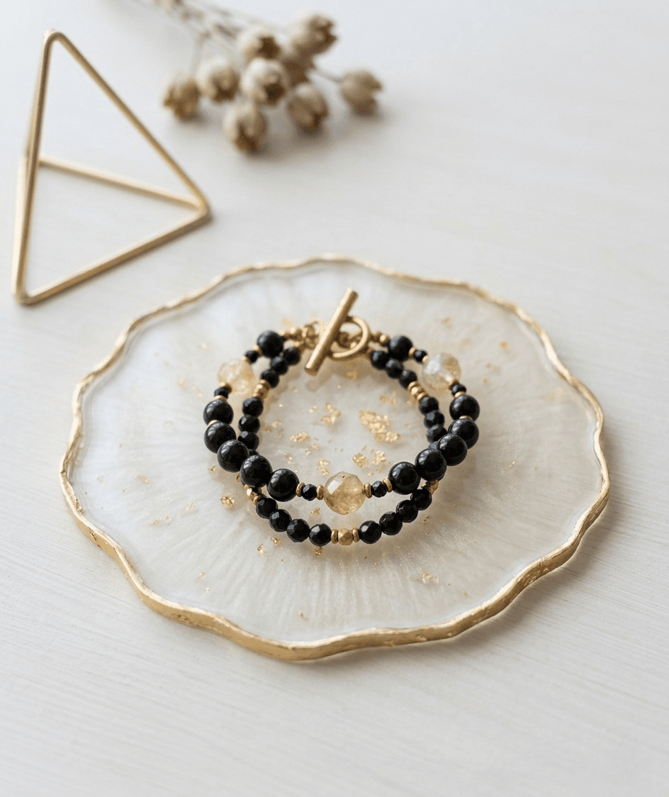 Ręcznie wykonana, podwójna bransoletka z naturalnych minerałów: turmalinu, cytrynu oraz pozłacanego hematytu. Eleganckie połączenie czerni, ciepłego koloru cytrynu i złotego połysku hematytu sprawia, że bransoletka pięknie prezentuje się na nadgarstku.