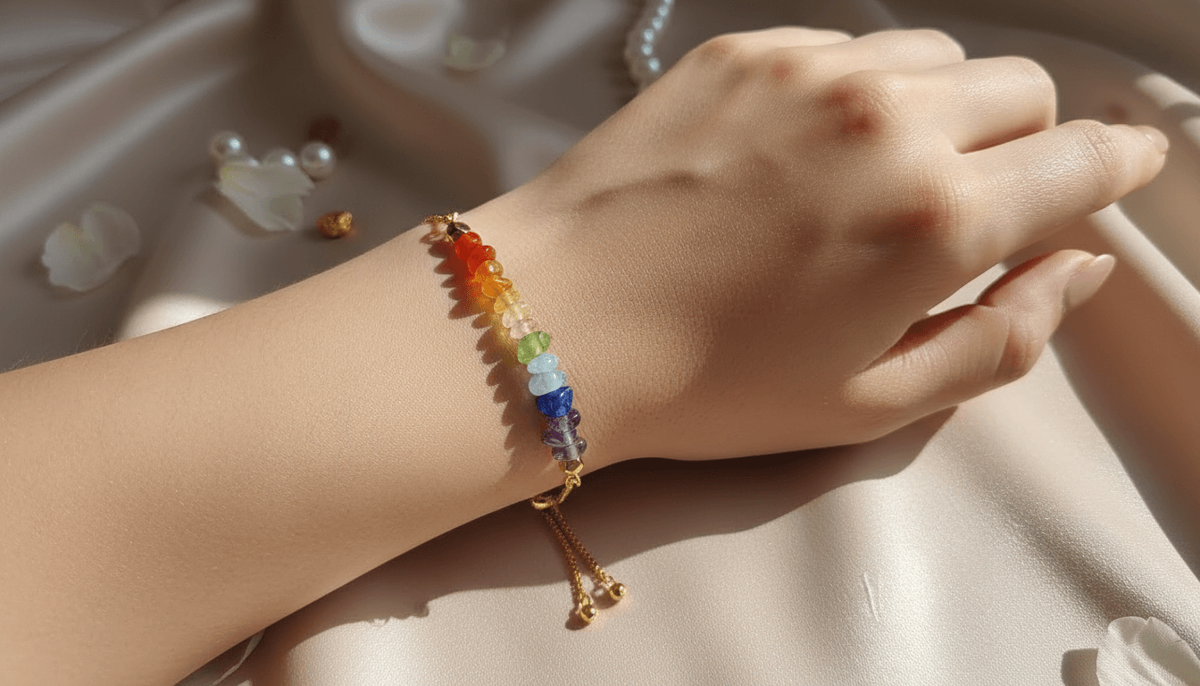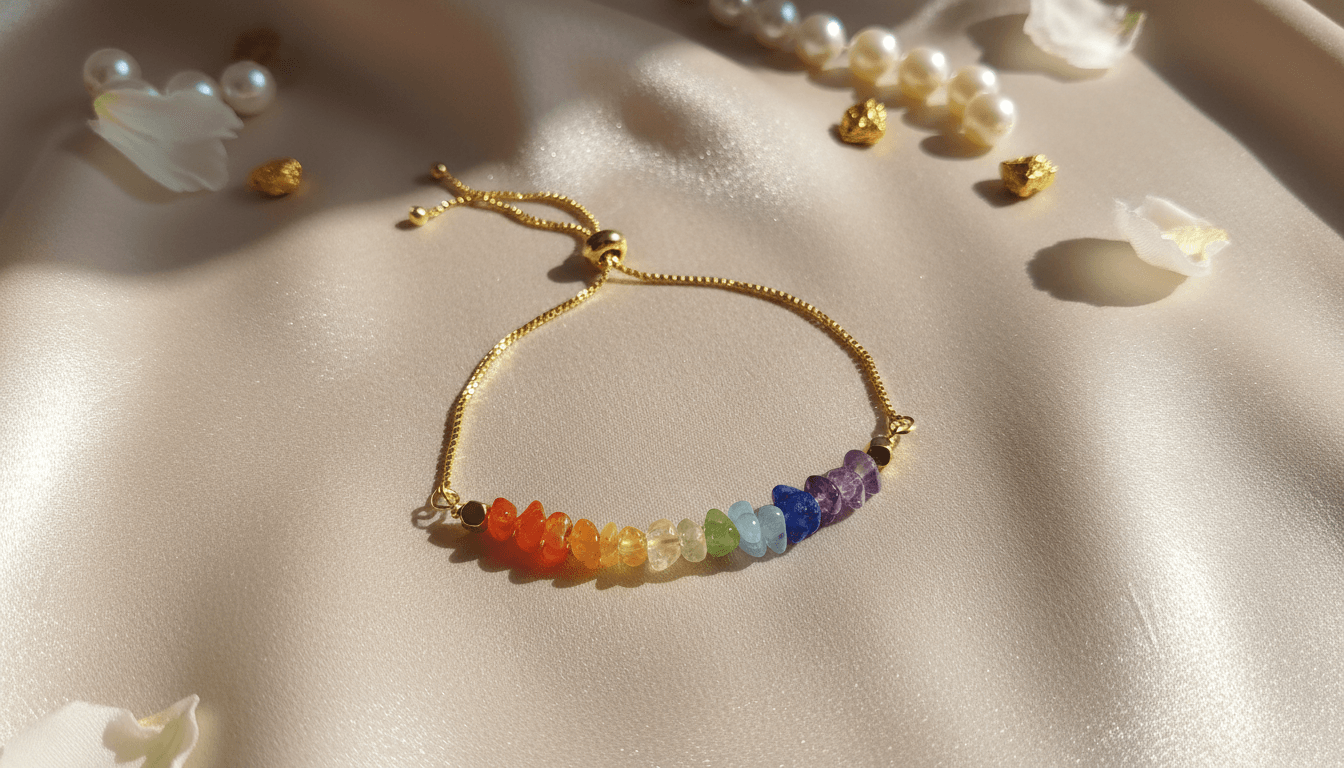 Elegancka bransoletka wykonana ze stali nierdzewnej w złotym odcieniu, ozdobiona naturalnymi kamieniami 7 czakr, symbolizującymi harmonię ciała, umysłu i energii.
