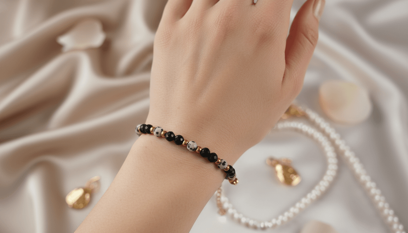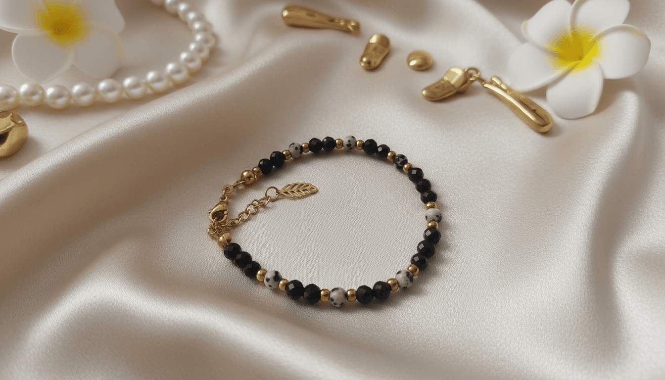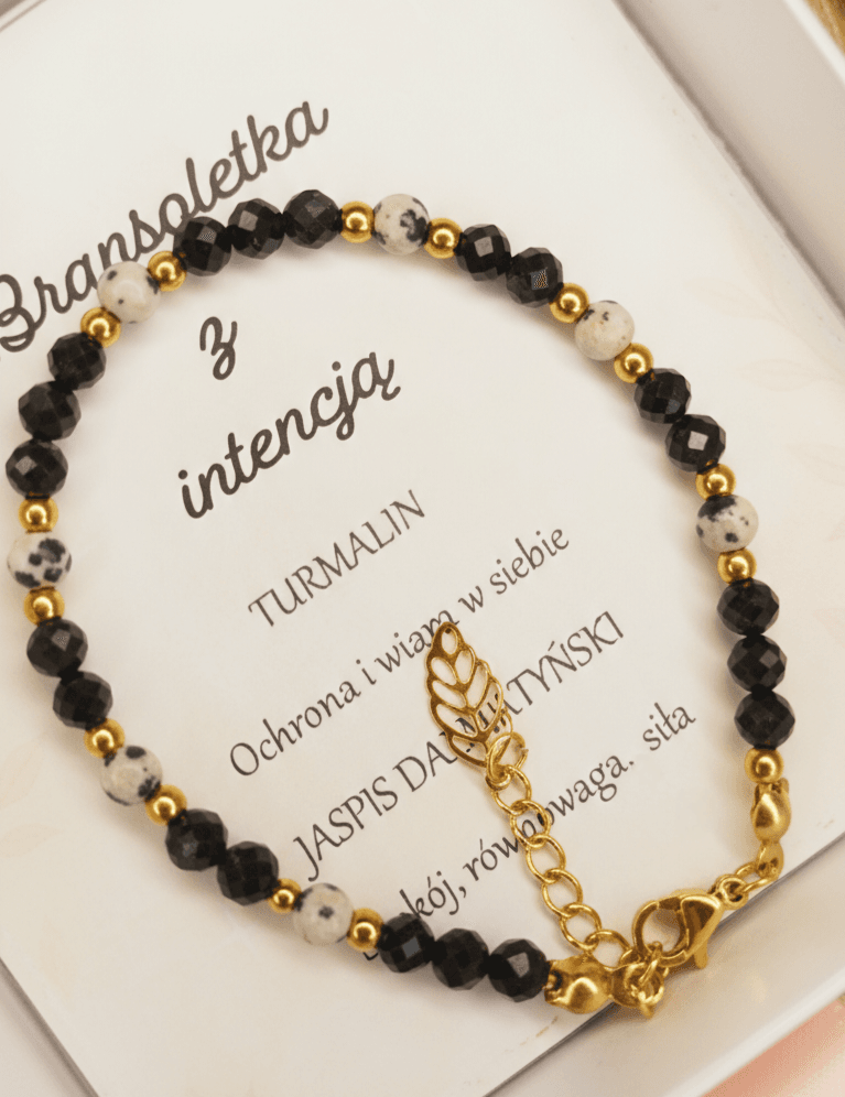 Subtelna, a jednocześnie pełna charakteru bransoletka wykonana z fasetowanego turmalinu 4 mm oraz kulki jaspisu dalmatyńskiego 4 mm, uzupełniona dodatkami ze stali nierdzewnej. Harmonijne połączenie czerni turmalinu i jasnego, nakrapianego jaspisu tworzy elegancką i uniwersalną biżuterię, która pasuje do każdej stylizacji.