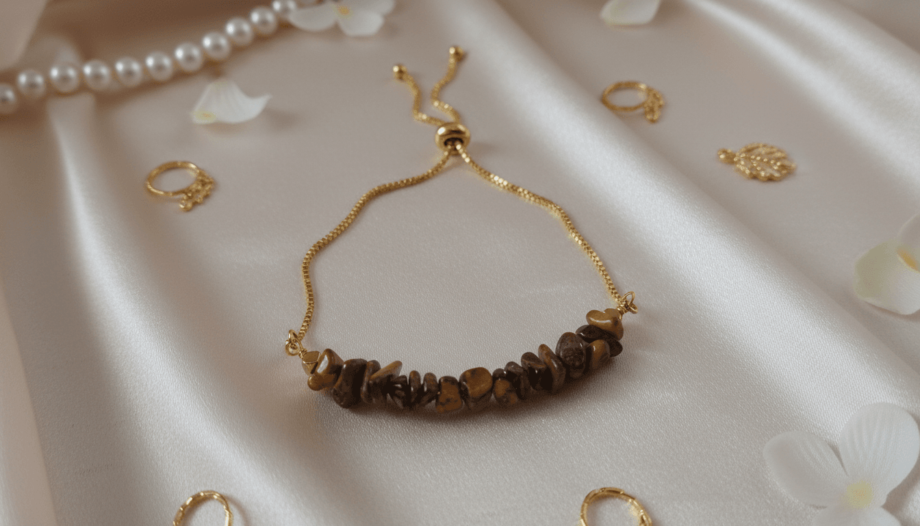Elegancka bransoletka wykonana ze stali nierdzewnej w złotym odcieniu, ozdobiona naturalnymi kamieniami tygrysiego oka. Ciepłe, złoto-brązowe refleksy minerału nadają biżuterii wyrazisty, a jednocześnie klasyczny charakter.