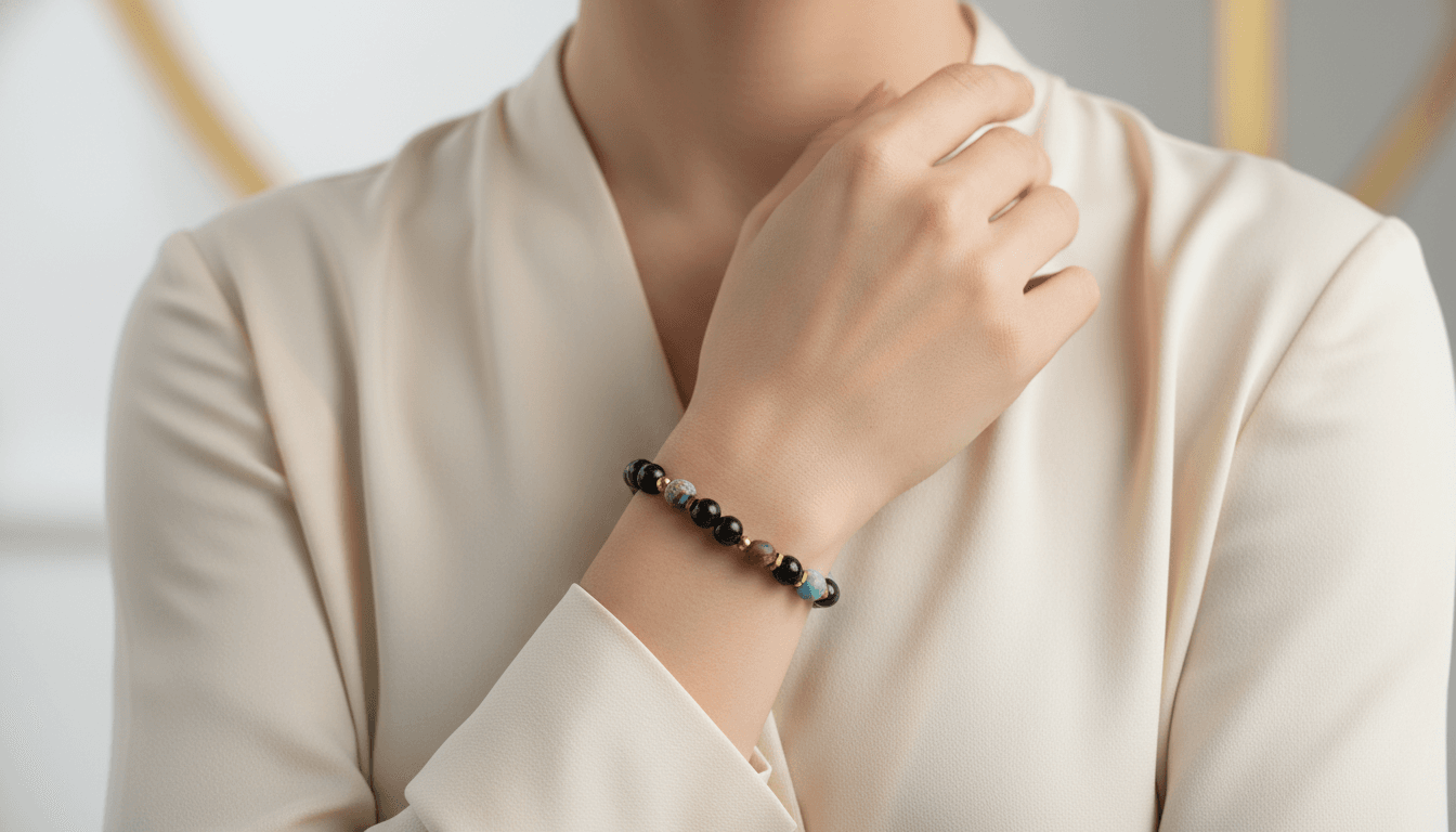 Bransoletka wykonana jest na trwałej silikonowej żyłce, dzięki czemu wygodnie dopasowuje się do nadgarstka i jest łatwa w codziennym noszeniu.