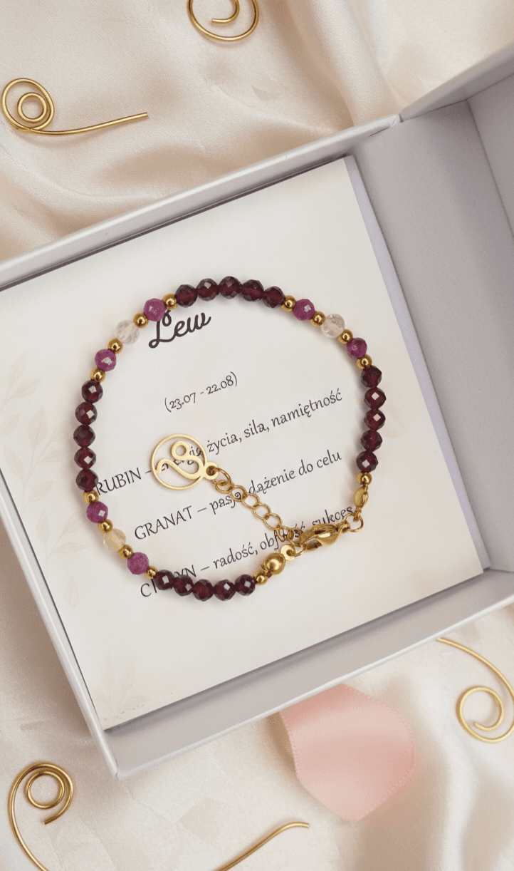 Delikatna bransoletka stworzona z myślą o osobach spod znaku Lwa. Starannie dobrane kamienie naturalne wspierają pewność siebie, odwagę i kreatywność, które są charakterystyczne dla tego znaku.