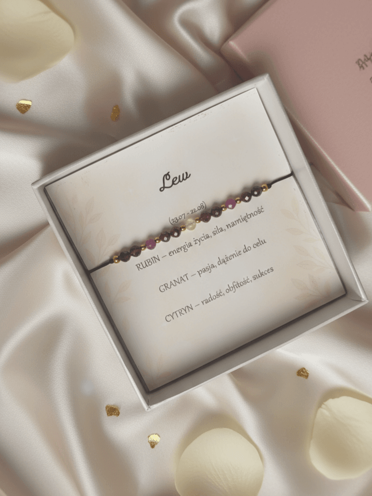 Przedstawiamy naszą wyjątkową bransoletkę na sznurku, zaprojektowaną z myślą o zodiakalnych Lwach. Ta starannie wykonana biżuteria łączy w sobie unikalne odcienie rubinów, głębię granatu oraz promienność cytrynu, tworząc niepowtarzalny dodatek, który doskonale oddaje charyzmę i siłę charakteru tego znaku.
