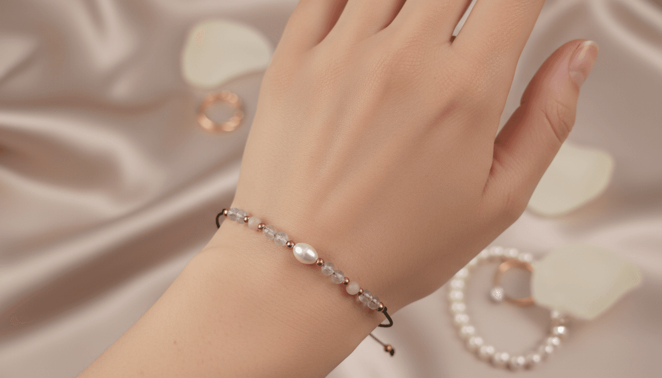 Bransoletka na sznurku dla Zodiakalnego Raka z kamieniem księżycowym, różowymi opalami i perłami słodkowodnymi