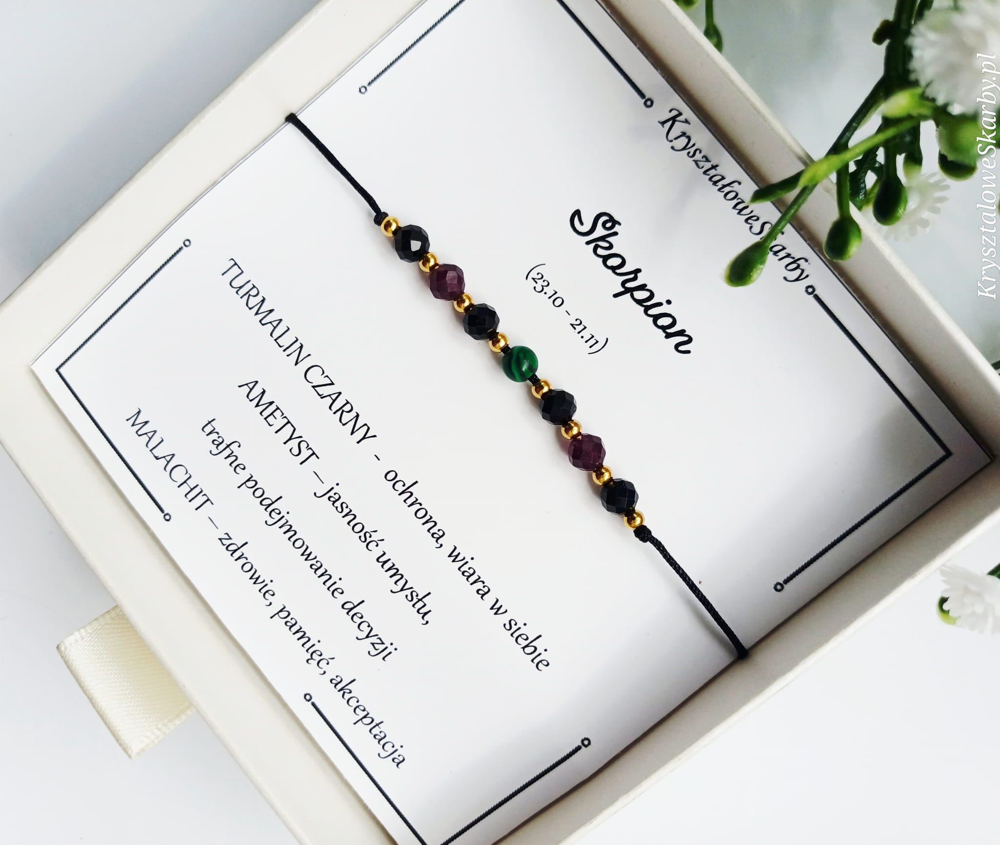 Przedstawiamy naszą wyjątkową bransoletkę na sznurku, stworzoną z myślą o zodiakalnych Skorpionach. Ta elegancka biżuteria łączy w sobie tajemniczy urok ametystu, mocny charakter czarnego turmalinu oraz intensywną energię malachitu, tworząc niepowtarzalny dodatek, który doskonale odzwierciedla głębię i intensywność osobowości tego znaku.