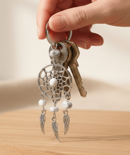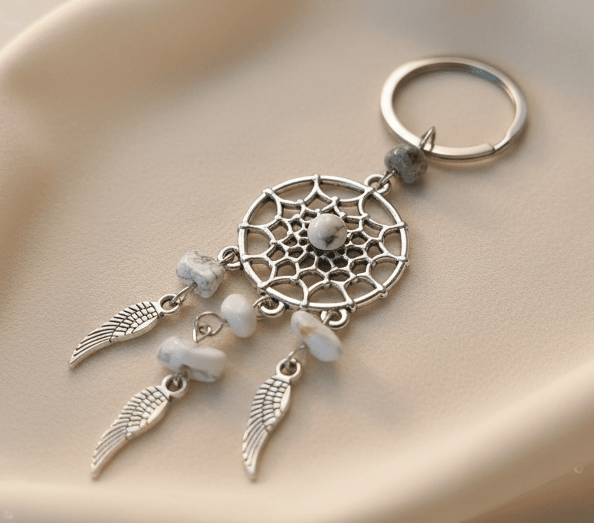 Subtelny i stylowy brelok inspirowany symbolem łapacza snów, który łączy w sobie delikatne piękno naturalnego kamienia i głębokie znaczenie. To wyjątkowy dodatek, który może towarzyszyć Ci każdego dnia.