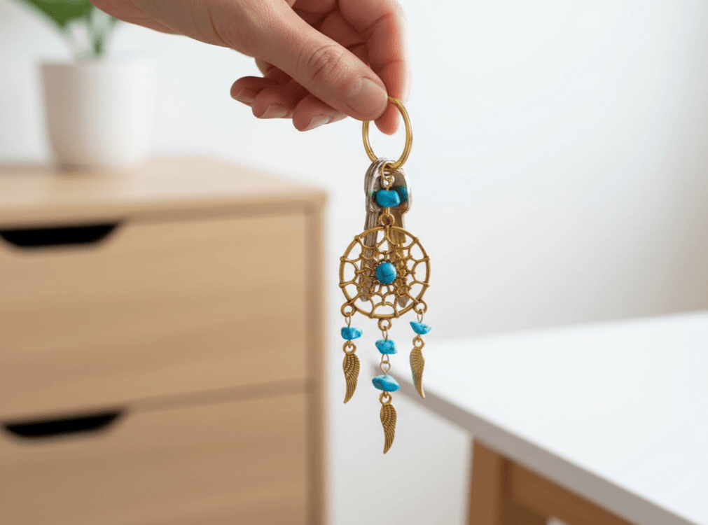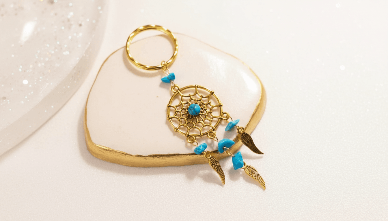 Wyjątkowy brelok inspirowany symbolem łapacza snów, łączący naturalne piękno kamienia z jego głębokim znaczeniem. To stylowy dodatek, który może towarzyszyć Ci każdego dnia jako mały talizman.
