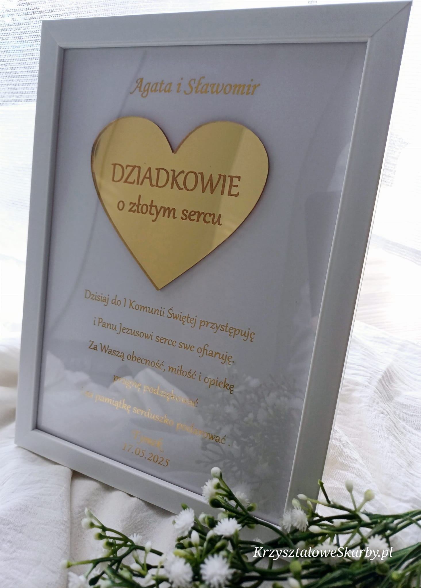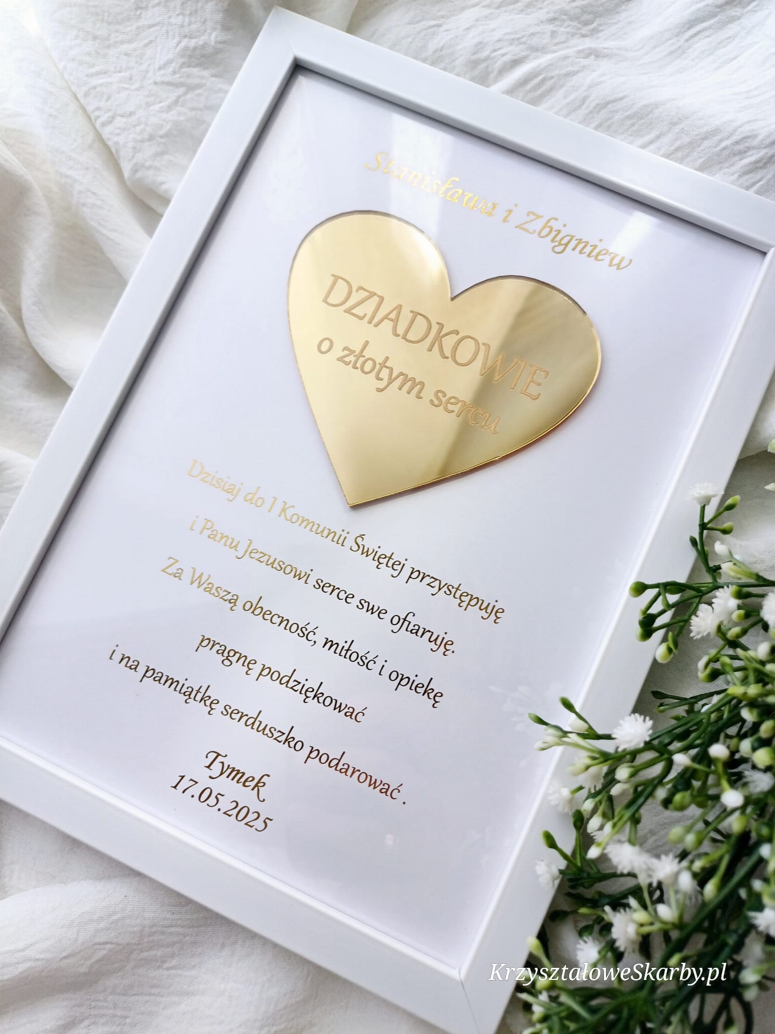 Wyjątkowy prezent dla ukochanych Dziadków – elegancka ramka z pozłacanym sercem i personalizowaną dedykacją. Idealna pamiątka z okazji Pierwszej Komunii Świętej, która wyrazi wdzięczność za obecność, miłość i opiekę.